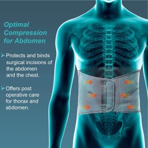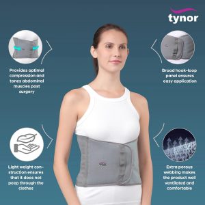 Tynor abdominal support is a compression belt to support the abdomen and compress the abdominal muscles. Its used as a post operative aid, by mothers after delivery and for waist line reduction.